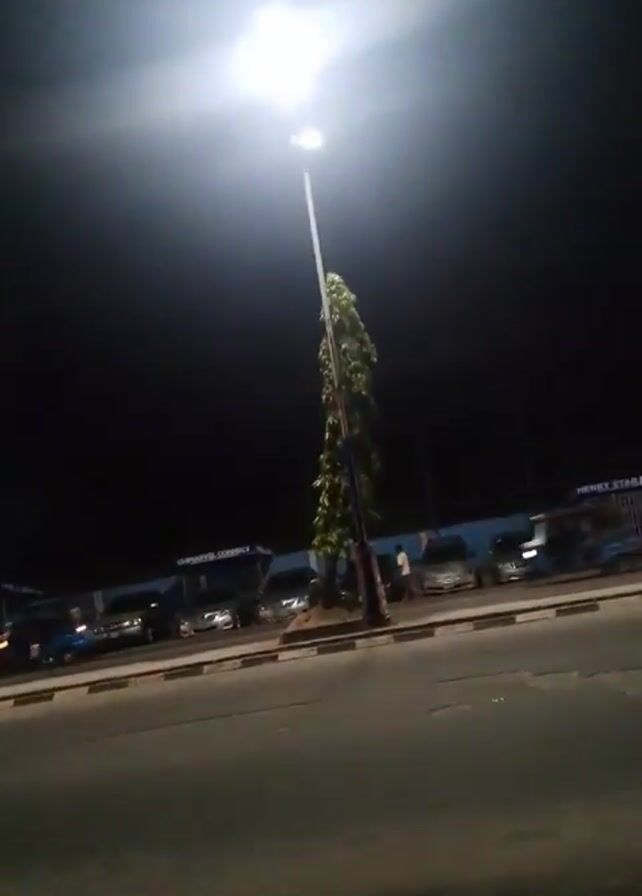 nighttime street scene. A tall street light illuminates a street with a line of parked cars along the right side. A tree stands next to the street light. Across the street, a building has signage, partially readable as "CHARISMA CONNECT" and "HENRY STAR MOTORS." A few people are walking near the parked cars and the building. Cars pass along the street. The overall lighting is dark, but the street light provides a bright focal point.