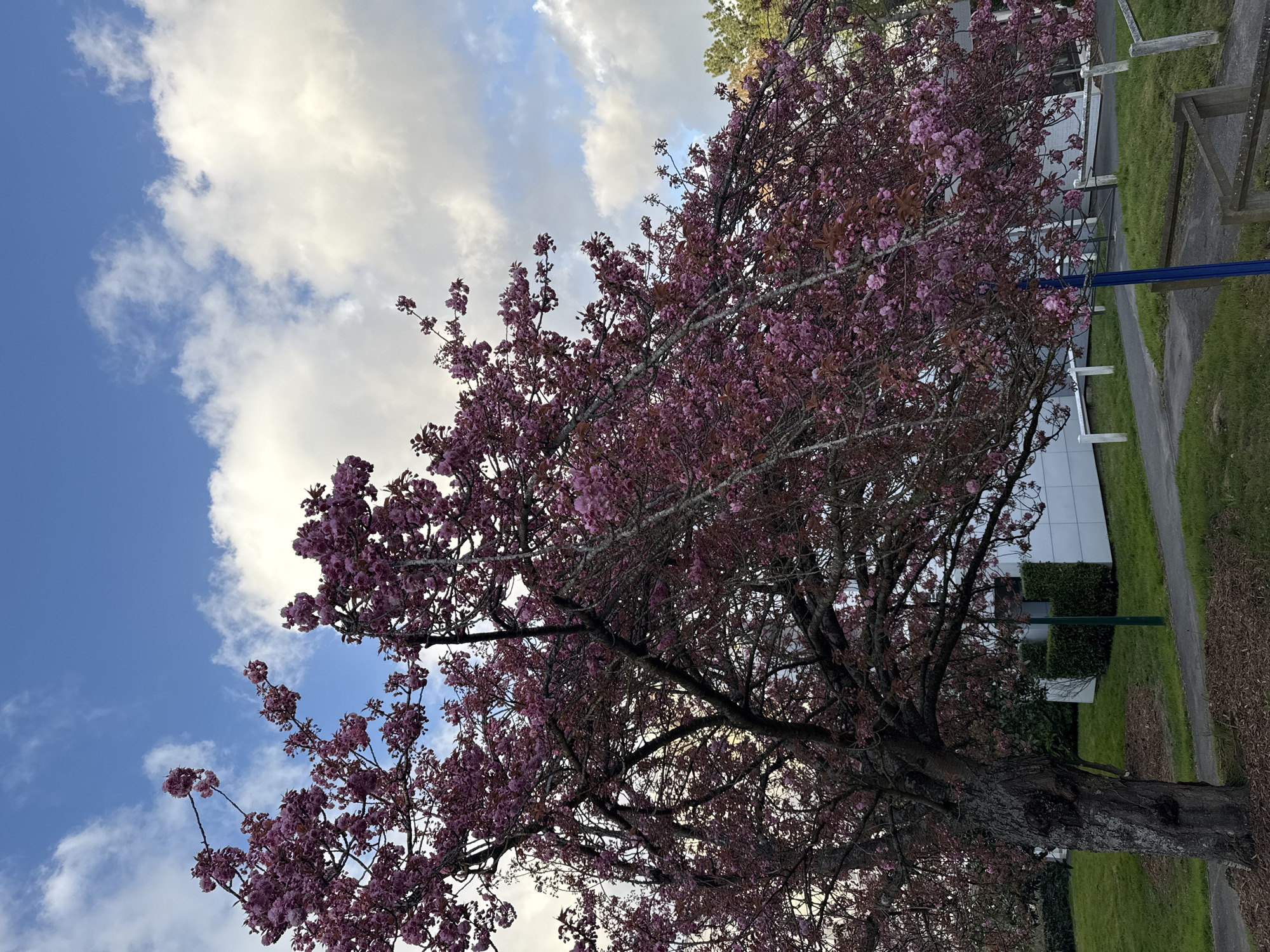 The image displays an outdoor scene in Les Ulis, France, featuring a large, mature deciduous tree covered in dense pink blossoms, occupying the left and central portions of the frame. The tree's branches, visible through the foliage, are dark and gnarled, contrasting with the vibrant flowers and some dark reddish-brown leaves. Above, the sky is clear blue with scattered white cumulus clouds. Below the tree, a grey paved pathway curves across a manicured lawn of green grass. The ground immediately surrounding the tree's base is covered with dark brown bark mulch. In the background, a modern building with white rectangular facade panels and dark window sections is partially visible through the tree's branches. Adjacent to the building are neatly trimmed green hedges. A slender, dark green pole is present in the grass near the building. To the right of the pathway, a prominent blue vertical pole stands, next to a low, light-colored barrier or fence section that extends horizontally. A portion of a tall, green coniferous tree is visible in the far right background. No individuals, animals, or active subjects are depicted.