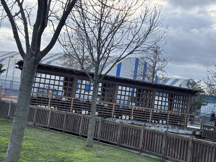 The image displays an outdoor scene in Zeytinburnu, Turkey, under a partly cloudy sky. The foreground features a grassy slope on the left, leading to a dark brown wooden fence that extends horizontally across the lower portion of the frame. Two bare-branched deciduous trees, one on the far left and another center-right, are prominent. In the midground, an elevated, elongated wooden building with a dark roof stands, characterized by numerous large, grid-patterned glass windows reflecting the sky and surrounding elements. Below this structure, a wooden railing defines a pathway or terrace. In the background, a substantial white tent-like structure with distinctive vertical and diagonal blue stripes is visible, suggestive of a large recreational or sports facility. To the right of the wooden building, several indistinct human figures are observed walking along the pathway, and a set of exterior stairs is partially visible. One individual is approaching the entrance of the wooden building from the right.