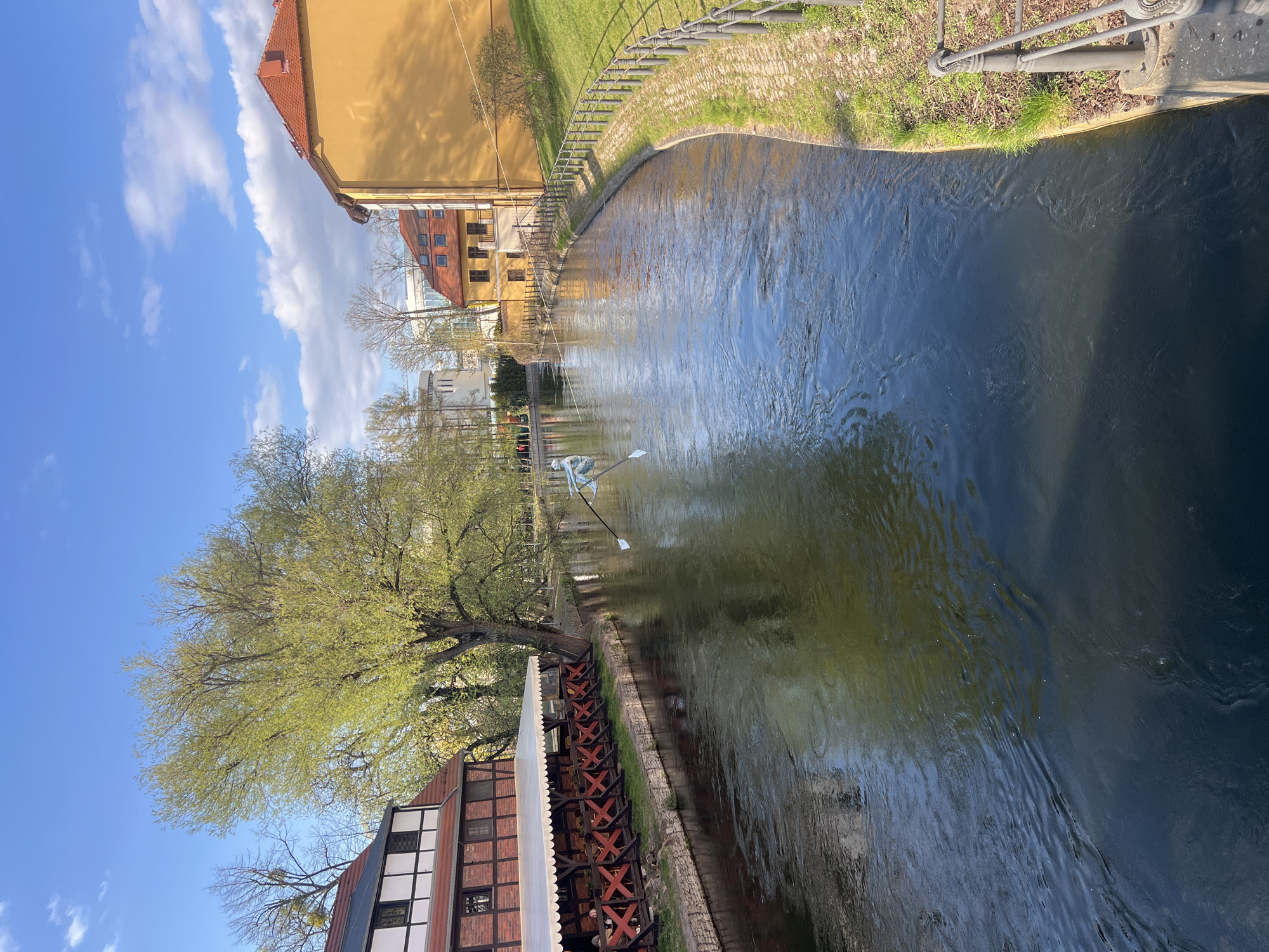 Brda River in Bydgoszcz, Poland. A rowboat is being used in the river. Buildings line the banks, including a yellow structure and a timber-framed building. The sky is blue with scattered clouds. The river's surface reflects the surrounding environment. A fence runs along one bank. A tree with green leaves is visible along the riverbank.
