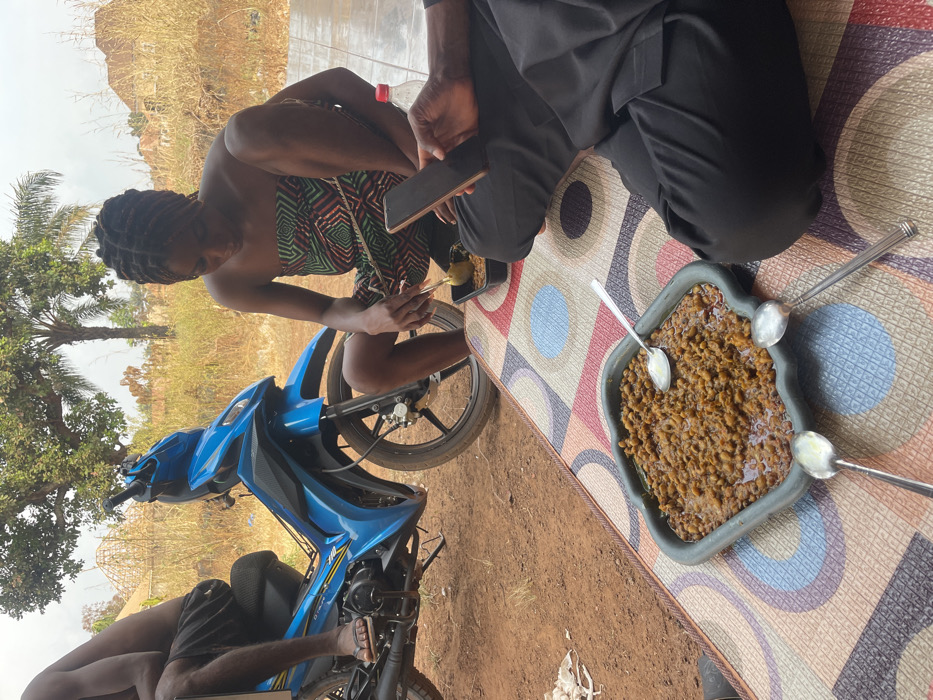 In Oturkpo, Nigeria, an outdoor scene depicts three individuals eating and resting