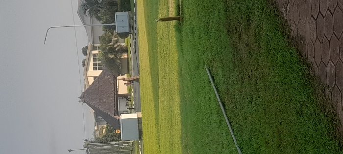 A grassy field occupies much of the scene. To the left, there's a building with a thatched roof and a white structure beside it, possibly a small shed. A few trees and a taller building are visible further in the background. A street lamp stands beside the tall building. On the right, a section of brick or tile walkway borders the grass. An object, possibly a metal pipe, lies in the grass. The sky is overcast.