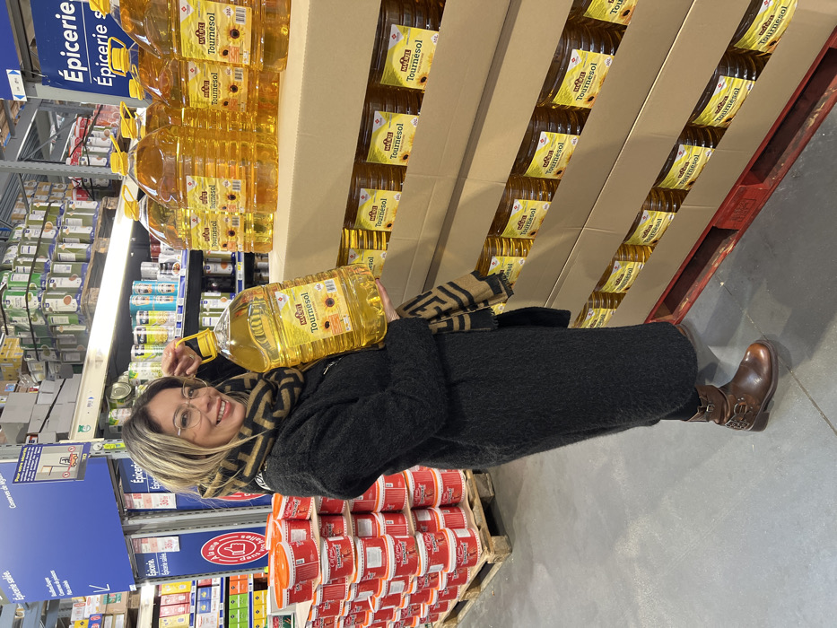 An adult female stands in a supermarket aisle in Hérouville-Saint-Clair, France