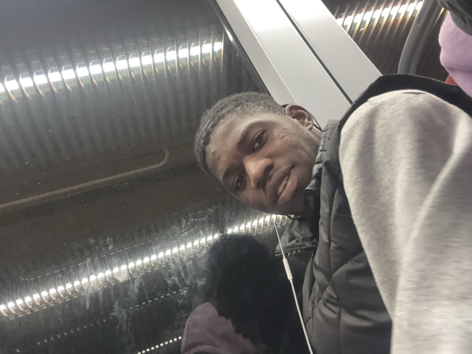 The image depicts a young male subject, appearing to be of African descent, captured in a close-up, slightly upward-angled shot. He has short, dark hair and some minor facial blemishes. He wears a black quilted vest over a light grey long-sleeved garment. A white earbud string is visible emanating from his left ear. The subject looks directly at the camera with a neutral expression. The scene is situated in Strasbourg, France. The immediate background features a dark, highly reflective ceiling or overhead panel that occupies the upper two-thirds of the frame. This surface displays numerous bright, linear light reflections arranged in parallel rows, indicating modern interior illumination. Faint smudges and residue are visible on the reflective surface. A thin, light-colored conduit or pipe runs horizontally across the upper left. A partial view of a dark, possibly furry, object is visible behind the subject's left shoulder, and a segment of light purple fabric is present in the lower right corner, suggesting additional occupants or belongings within a generic indoor public space.