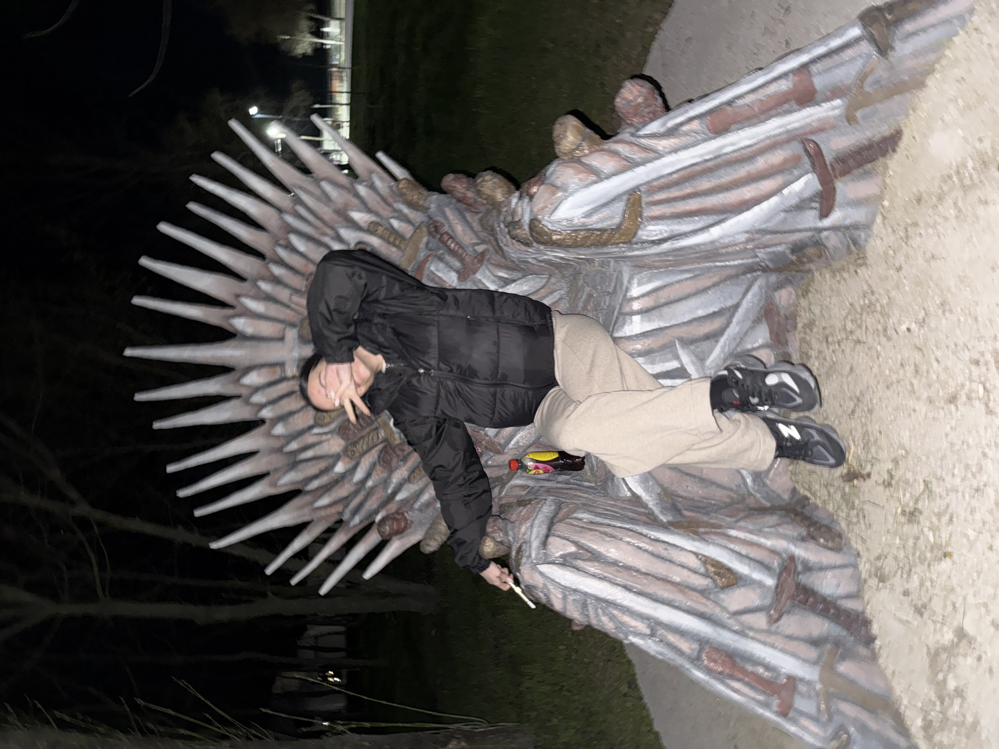 A nighttime image depicts a person seated on a replica of the Iron Throne in an outdoor public space within the city of Rakovski, Bulgaria. The throne, primarily grey with reddish-brown accents, is textured to resemble an assemblage of swords and tools, and rests on a ground cover of light-colored earth and gravel. To its right, a concrete path borders green grass. Dark, bare trees form the background, with distant artificial lighting visible beyond them. The individual is dressed in a black puffer jacket, beige trousers, and black and white athletic sneakers. They are positioned centrally on the throne, facing the camera. Their left hand is raised, obscuring the upper part of their face with a two-finger V-gesture. A thin, white cylindrical object is held in their extended right hand. A plastic beverage bottle with a red label and yellow cap is placed on the throne's right armrest.