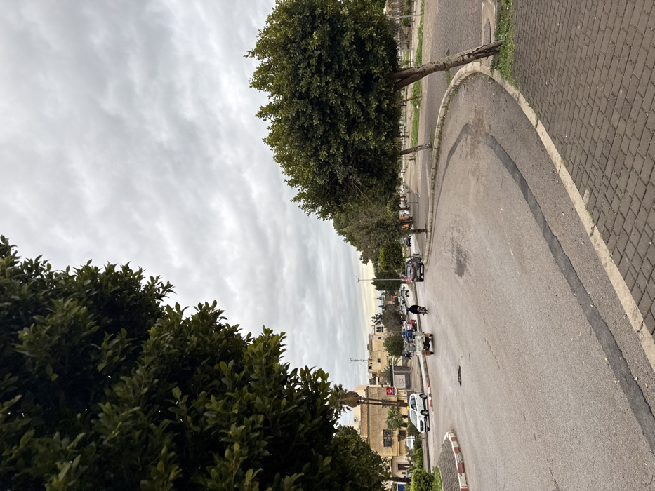 A street scene in Fez, Morocco, is depicted under an overcast, grey sky. The asphalt road curves from the foreground towards the left and recedes into the distance, appearing damp in sections. A white and red striped curb delineates the left side of the road, bordering a central island, while a dark brick-patterned sidewalk runs along the right side, backed by a row of small, rounded green trees. A large, leafy tree partially frames the upper left portion of the image. In the left lane of the road, a three-wheeled motortrike is visible, moving away from the viewer. Immediately behind it, a person on a dark motorcycle is also traveling in the same direction. Further along the left side of the road, a white sedan is stationary near a collection of light-colored, multi-story buildings with flat roofs. A single palm tree is visible among these structures. Additional vehicles are present in the far background, indicating ongoing traffic. The area beyond the right-hand sidewalk appears to be an unpaved, sparsely vegetated expanse.