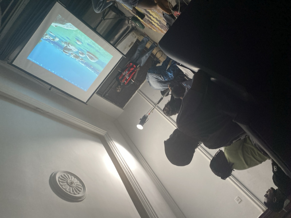 A room with a projector screen displaying a blue sky and ocean scene. People stand beneath the screen, some facing the viewer, others looking at the presentation. A spotlight shines downward. Ornate ceiling decorations are visible along the white wall. The camera angle is tilted, adding a dynamic perspective to the indoor scene.