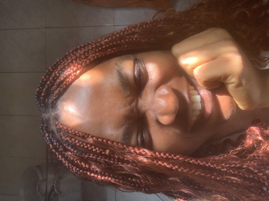 The image captures a close-up portrait of an individual with dark brown skin and reddish-brown box braids, parted centrally
