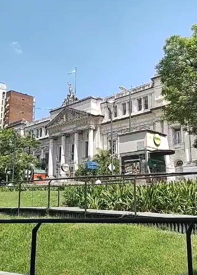 The video presents a wide, static shot of an urban scene on a sunny day. A large, white building with classical architectural features dominates the background, adorned with a flagpole flying a light blue and white flag. In front of the building is a landscaped area with green grass, interspersed with plants. A black metal railing runs along the edge of the landscaping, separating it from a paved walkway. To the left of the main building are several high-rise buildings, some with balconies and others with brick facades. Trees are interspersed among the buildings, adding patches of greenery. A small vendor stall can be seen to the right of the main building. The sky is blue with a few scattered white clouds.
