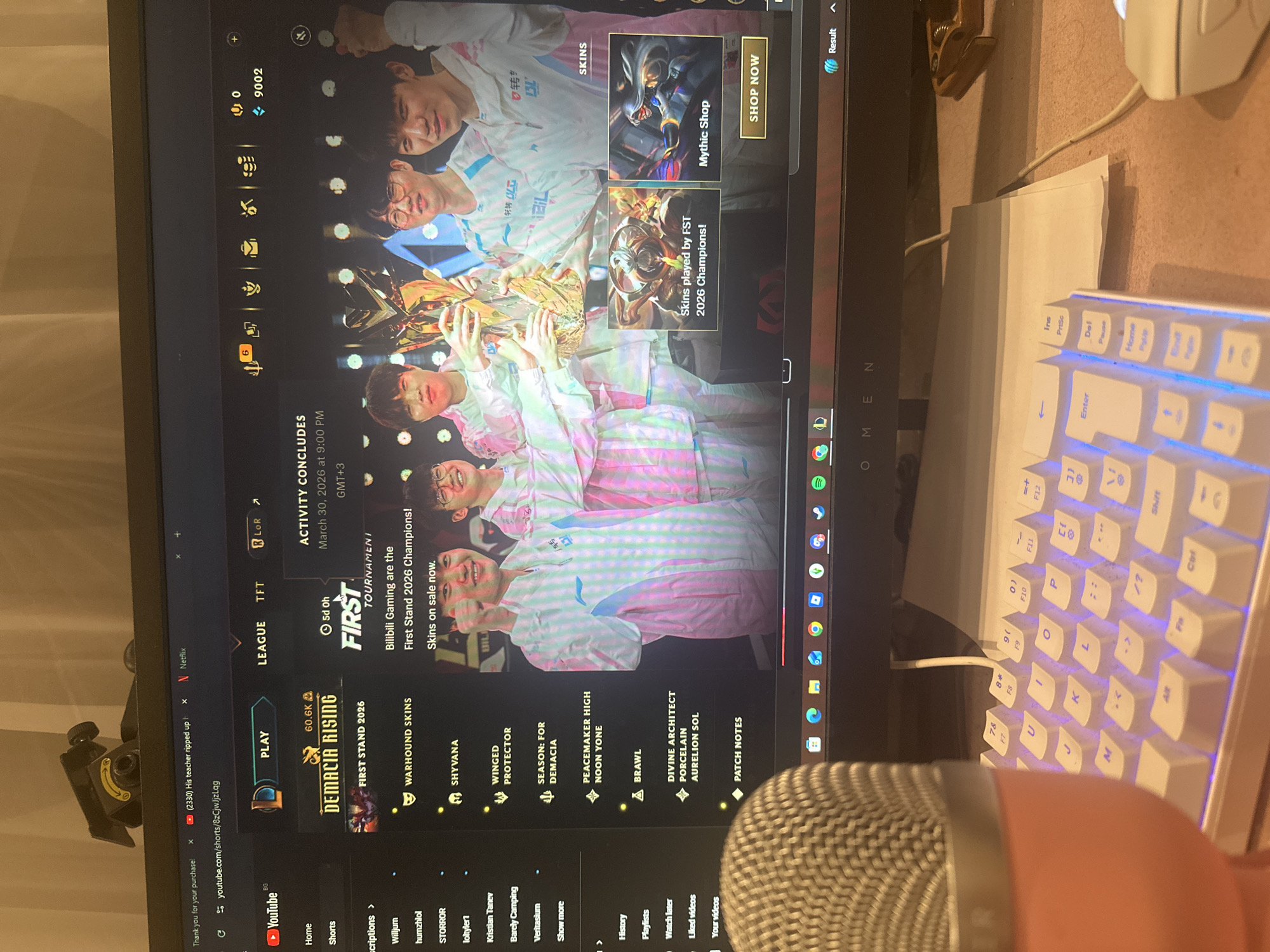 An indoor scene depicts a computer desk setup. The central focus is an OMEN-branded computer monitor displaying the League of Legends client. At the top of the monitor, browser tabs for YouTube (showing a short) and Netflix are visible. The League of Legends client's main view shows an "ACTIVITY CONCLUDES" banner dated "March 30, 2026 at 9:00 PM GMT+3". Below this, text identifies "FIRST STAND 2026 TOURNAMENT!" and states "Bilibili Gaming are the First Stand 2026 Champions! Skins on sale now." A prominent image features five male esports players, predominantly East Asian, celebrating and holding a large golden trophy. The players wear light-colored tracksuits with sponsor logos. The left panel of the client displays "DEMACIA RISING" with a "60.6K" indicator, alongside various game options, skin categories (e.g., "WARHOUND SKINS"), and account navigation. Resource counts of "0" and "9002" are visible in the top right of the client. The Windows taskbar is visible at the bottom of the monitor, showing icons for applications like Spotify and Google Chrome. Above the monitor, a black, angular device with a yellow circular adjustment dial is mounted. In the foreground, a partially visible microphone with a mesh top and an orange/pink body is positioned on the left. A white mechanical keyboard with purple/blue backlighting is centrally located, with a stack of white paper behind it. A white computer mouse is partially visible on the right. The desk surface is light brown, and white cables are present. This scene is located in Varna, Bulgaria, indicated by the "GMT+3" timezone displayed on the monitor.
