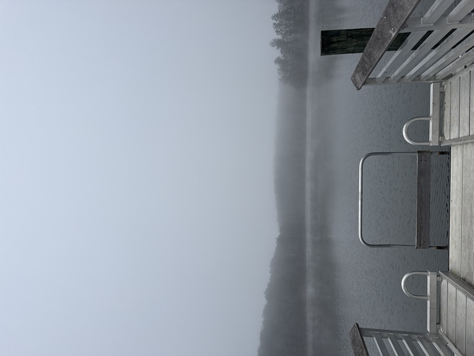 A hazy, grayscale image shows a view from a dock. The wooden dock structure and railings are on the right side. A body of water extends to the center, and the far shore, obscured by fog, is visible in the background. Dense fog dominates the left side of the frame, blurring the landscape.