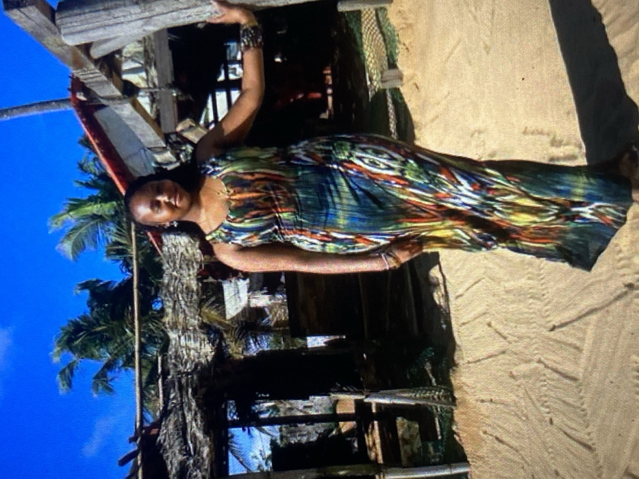 A woman in a patterned dress stands near a structure with a thatched roof, likely on a beach. Palm trees are visible in the background against a bright blue sky. The woman is wearing bracelets and a necklace. The setting suggests a tropical or coastal location. The lighting is bright and sunny, casting shadows.