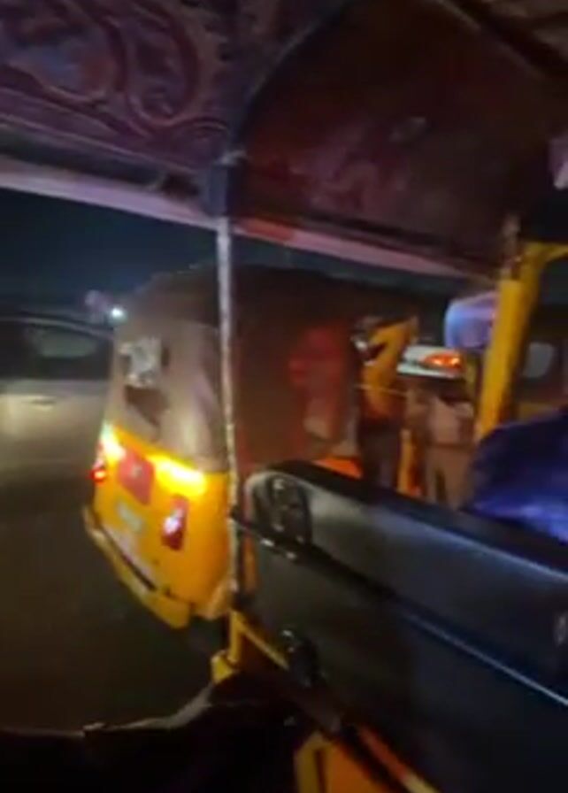 interior of a yellow and red auto rickshaw in traffic at night. We see the back of the driver of the rickshaw as well as the decorated ceiling of the rickshaw. Other rickshaws are in the foreground and middle ground. In the background, a white sedan is partially visible. Street lights illuminate the scene.