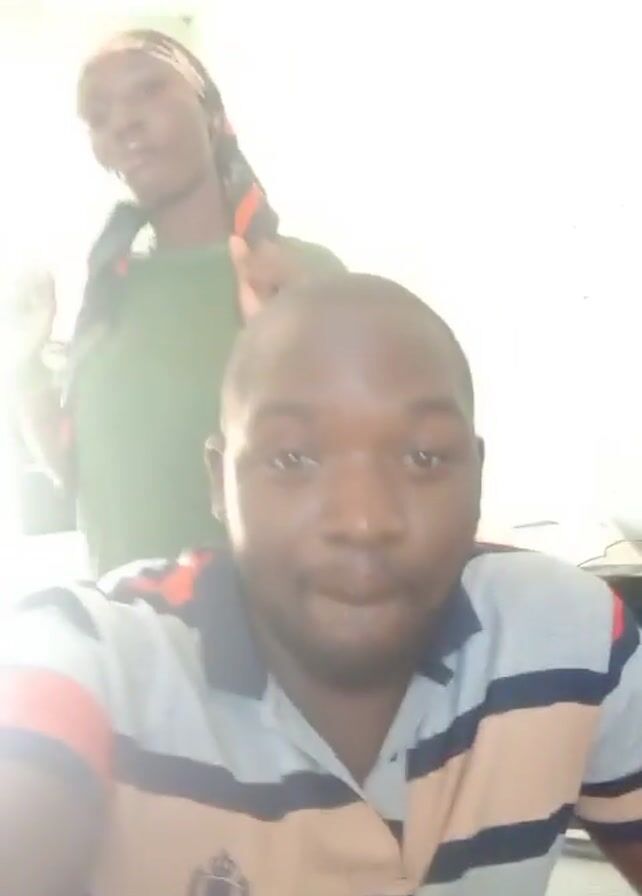 Two people are visible in the video. A dark-skinned man is in the foreground, wearing a striped polo shirt. He appears to be holding the camera. Behind him, a dark-skinned woman in a green shirt and a headscarf is gesturing with her hands, seemingly dancing. The background is a bright, plain white wall. The overall lighting in the room is bright, making the details slightly washed out. There is a rhythmic, upbeat music playing.