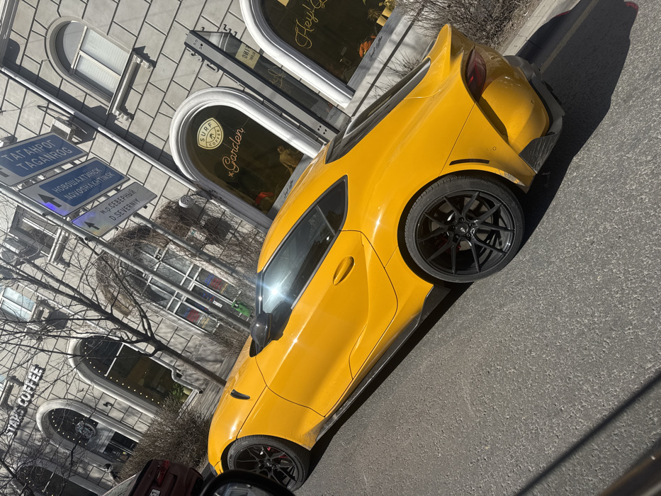 The image depicts an urban street scene on a clear, sunny day in Rostov-on-Don, Russia. The primary subject is a bright yellow two-door Toyota GR Supra (A90/A91 generation) sports car, parked or stationary on the asphalt pavement, oriented with its front facing left. The car features black multi-spoke wheels, with red brake calipers visible on the front wheel, and carbon fiber-look aerodynamic elements on its side skirts and rear bumper area. Intense sunlight reflects off its glossy surface. To the right of the vehicle, a substantial, light-colored building with an ornate facade and multiple arched windows lines the street. Signage on the building identifies commercial establishments: "STARS COFFEE" is partially visible to the left, and "SURF COFFEE x Garden" is prominently displayed on an arched window to the right. Above these businesses, multiple blue and white directional street signs, written in Cyrillic, indicate routes towards "TAGANROG," "NOVOSHAKHTINSK," and "M. P. SEVERNIY" (likely referring to a Northern district or direction). Based on these identifying signs, the location is consistent with Bolshaya Sadovaya Street, specifically near building number 98, in Rostov-on-Don. Bare deciduous trees and low, leafless shrubbery line the sidewalk between the street and the building. A portion of another dark-colored vehicle is visible on the far left, in front of the yellow sports car. No individuals are discernible in the scene. Distinct shadows are cast on the pavement, indicating the presence of direct sunlight.