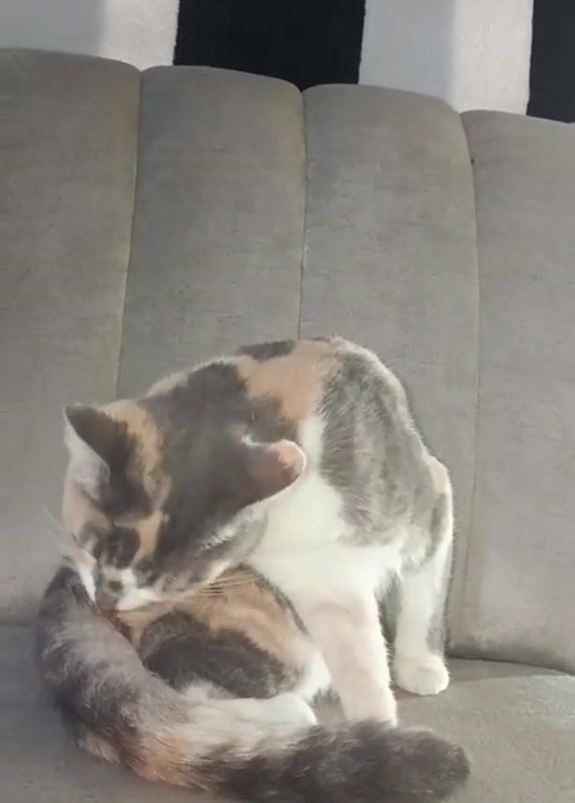 A cat sits on a gray couch and grooms itself. The cat is calico, with patches of gray, white, and orange fur. The couch has vertical seams and a patterned blanket or wall behind it. The cat is curled up and licking its tail.