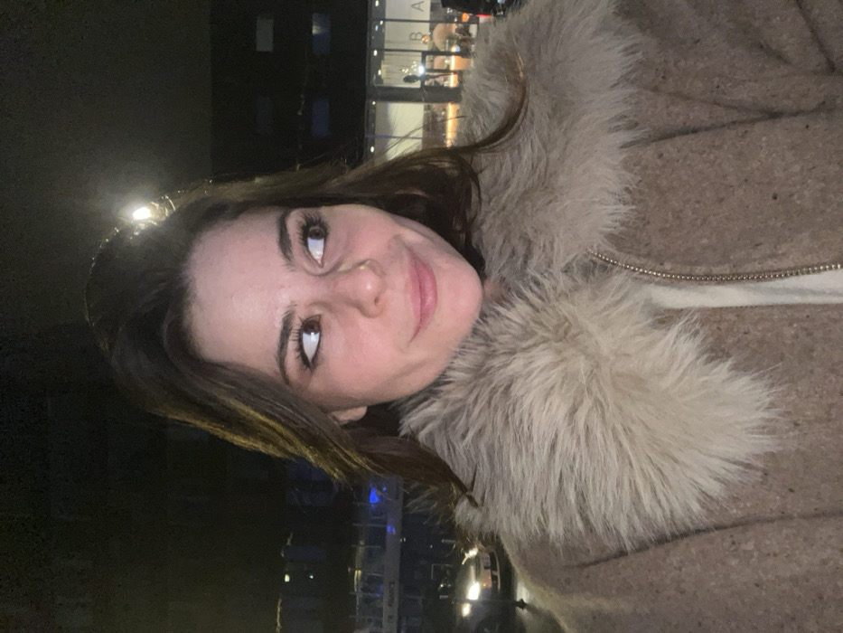 A woman poses outdoors, wearing a brown coat with a large, light-colored fur collar. She has brown hair and a small nose ring. The background is dark with blurred lights, suggesting an urban night scene. The image is slightly rotated to the side. A building is visible in the background, with illuminated signage.