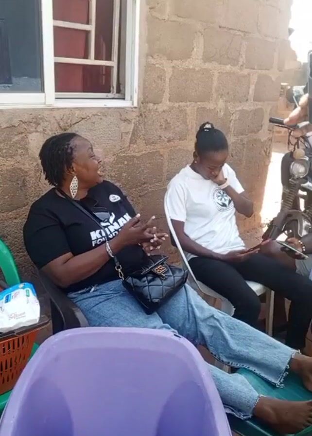 group of people outdoors. The camera is held by a woman in a black shirt with a colorful logo, likely filming the scene. Several individuals are sitting on plastic chairs. One woman wears a black shirt with a similar logo and light blue jeans, while another wears a white shirt and black pants. Some people are using their phones, possibly taking pictures or recording videos. A man in a white shirt is holding a phone, seemingly taking a picture. In the background, there's a motorcycle, a brick building with a window, and other individuals standing around. There are plastic basins, some containing items wrapped in plastic, near the seated individuals. The overall environment appears to be a casual outdoor gathering.
