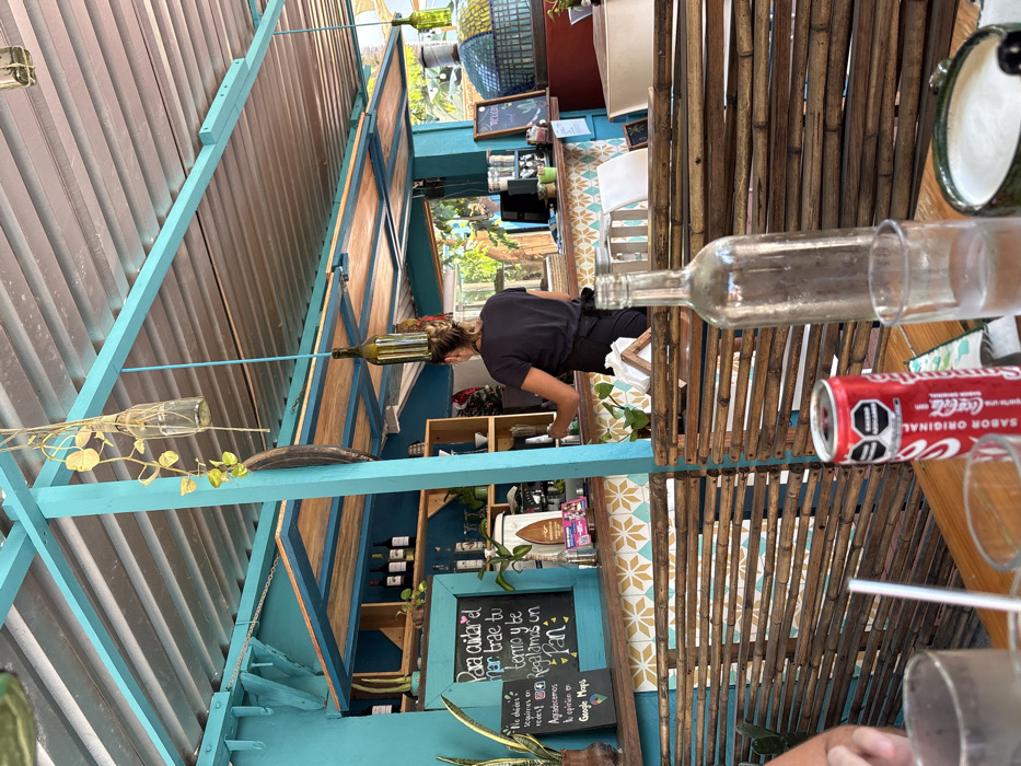 Inside a vibrant, open-air eatery, a server dressed in black is seen near a bar area. A Coca-Cola can and empty glass bottles are prominently placed on a table constructed of bamboo. A sign with Spanish text promoting sustainability, along with a hand-written blackboard with menu items, add to the unique decor. A light blue framework supports the roof, while strung glass bottles act as decorations.