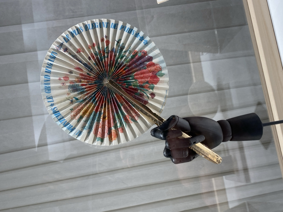 A fan is displayed behind glass, held by a black wooden hand. The fan is folded and decorated with floral patterns and lettering in blue around the edge, reading "PRINTEMPS * LE GRAND MAGASIN * LE PLUS ELEGANT DE PARIS". The fan's handle is visible, made of metal. The wooden hand is posed in a gripping position, seemingly holding the fan. The glass surface reflects the environment, including horizontal blinds. A wooden frame is partially visible on the right.