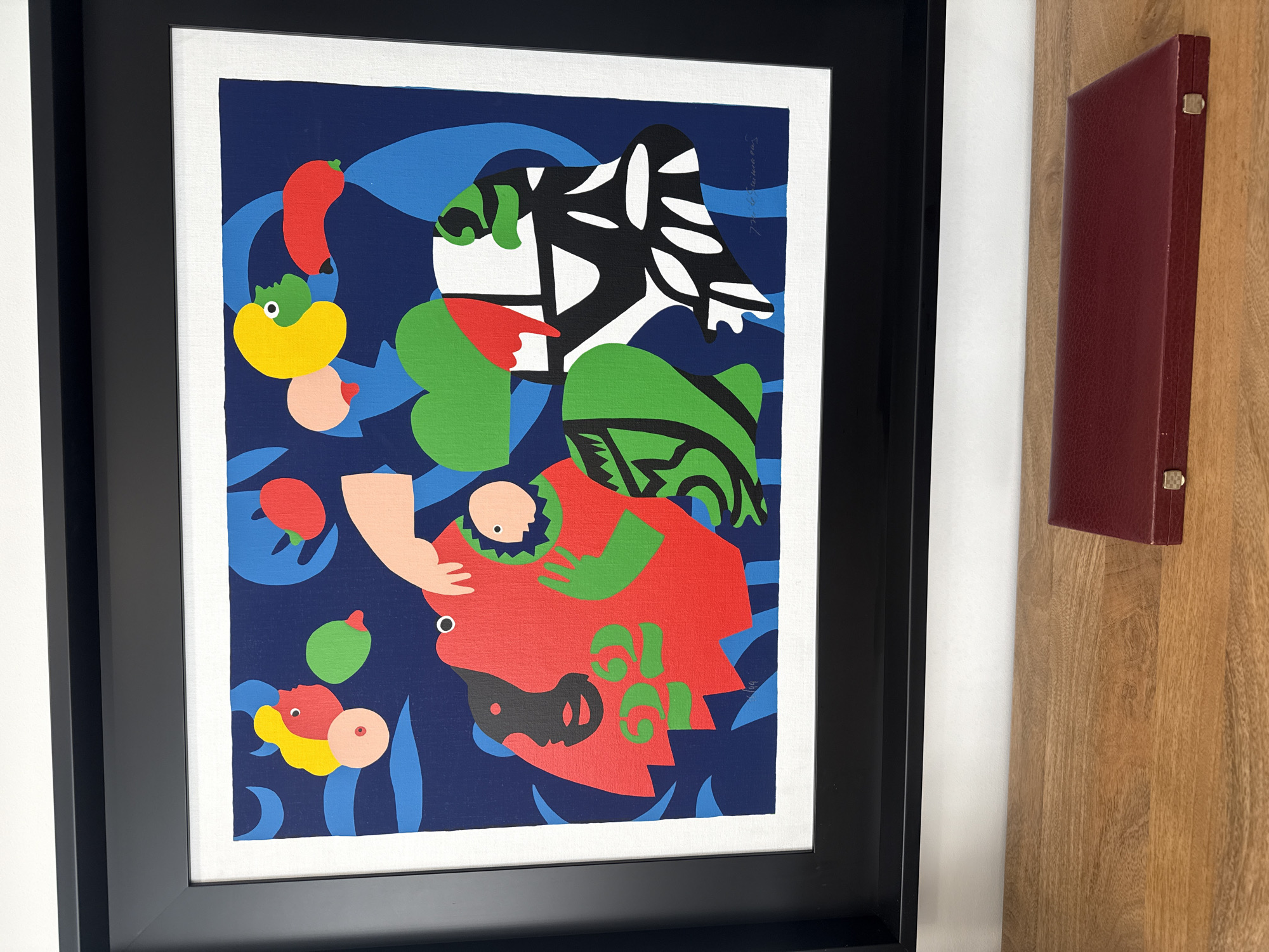 A framed abstract artwork is positioned against a white wall, resting above a polished wooden surface. The artwork, a print, features a dark blue background populated by various stylized figures and geometric shapes in bold primary and secondary colors including red, green, black, white, yellow, and light pink. Key figures include: a yellow-haired, light pink-faced individual with a circular element in the upper left; a yellow-haired, green-faced individual in the upper right; a large red figure with a black facial profile and green '22' numbering, holding or interacting with a smaller, light pink-faced, green-bodied figure; a large green figure; and a prominent black and white abstract mask-like figure in the lower right. A signature is visible in the bottom right corner of the print, along with what appears to be a limited edition number, e.g., " /99." The artwork is enclosed within a black, rectangular frame with a white mat. On the wooden surface to the right, a closed, rectangular, dark red case with two metallic clasps is present. This scene is located in the city of Torres Vedras, Portugal.