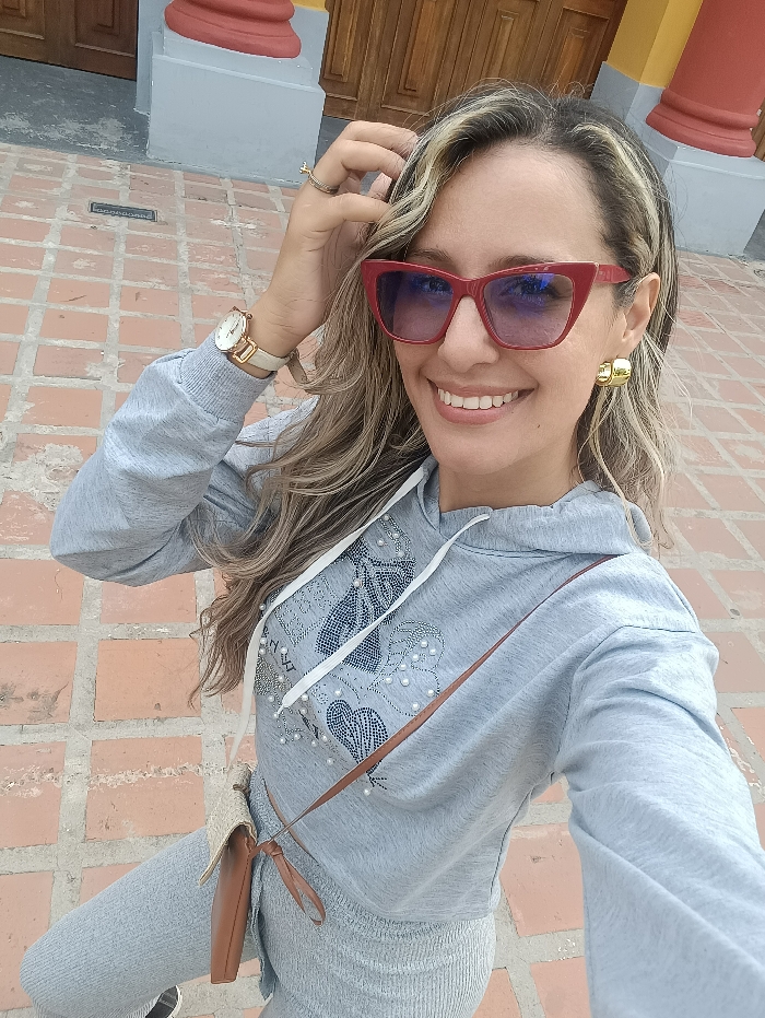 A woman poses for a selfie outdoors, wearing a grey hooded sweatshirt and matching pants. The sweatshirt has decorative pearls and blue patterns. She accessorizes with red sunglasses, gold hoop earrings, and a watch. A small brown purse hangs across her body. She smiles, running her hand through her highlighted hair. The background includes a building with colorful columns and a brick-paved area.