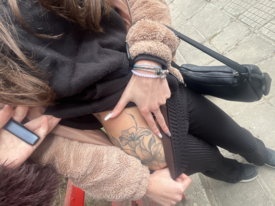 A person is depicted from an overhead perspective, seated outdoors on what appears to be a red wooden bench. The individual wears a light brown, possibly sherpa-textured, jacket over a black garment, and black vertically striped trousers. Black sneakers with white soles are visible on the feet. The left hand holds a black VEEV brand vape device. The right hand is positioned to pull up the black trousers on the upper right thigh, revealing a large, monochrome tattoo of lilies or similar flowers. The right wrist displays multiple bracelets, including beaded ones and a charm bracelet with a cross-like charm and another resembling a skull or animal head. A black shoulder bag with a zipper and a heart-shaped charm is visible by the person's right side. The ground beneath the subject is paved with light-colored square tiles or flagstones. Sparse vegetation or dirt is visible in the background. No specific landmarks are discernible to confirm a precise location within Yambol, Bulgaria.