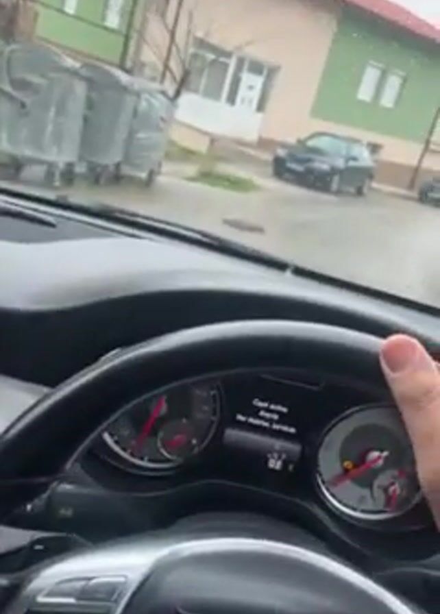 From the driver's seat of a Mercedes-Benz, a person grips the steering wheel as the vehicle idles on a wet street in a residential area. Through the rain-streaked windshield, several houses are visible, painted in light green, beige, and white. Several other vehicles, including an Audi A3, are parked along the street. Three metal garbage bins are located on the left. The car's dashboard displays system messages in a language other than English, and indicator lights are illuminated.