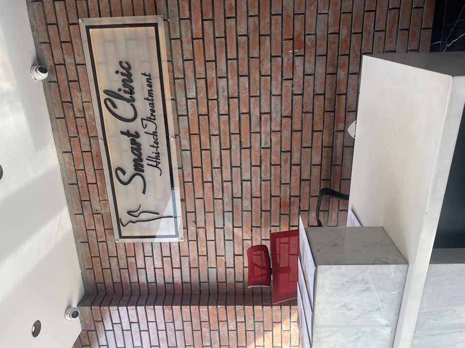The image displays the reception area of a medical facility identified as "Smart Clinic Hi-tech Treatment" in Casablanca, Morocco