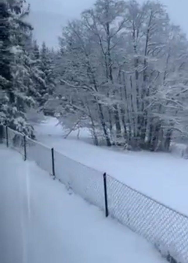 view from inside a train or bus looking out onto a snow-covered landscape. A chain-link fence runs parallel to the vehicle, separating the road from a field of snow. Beyond the fence are trees, heavily laden with snow, creating a winter wonderland scene. The snow is thick and appears fresh, covering the ground and the branches of the trees. The sky is overcast, contributing to the overall muted, white-dominant color palette. The camera angle and movement suggest the view is from a moving vehicle.