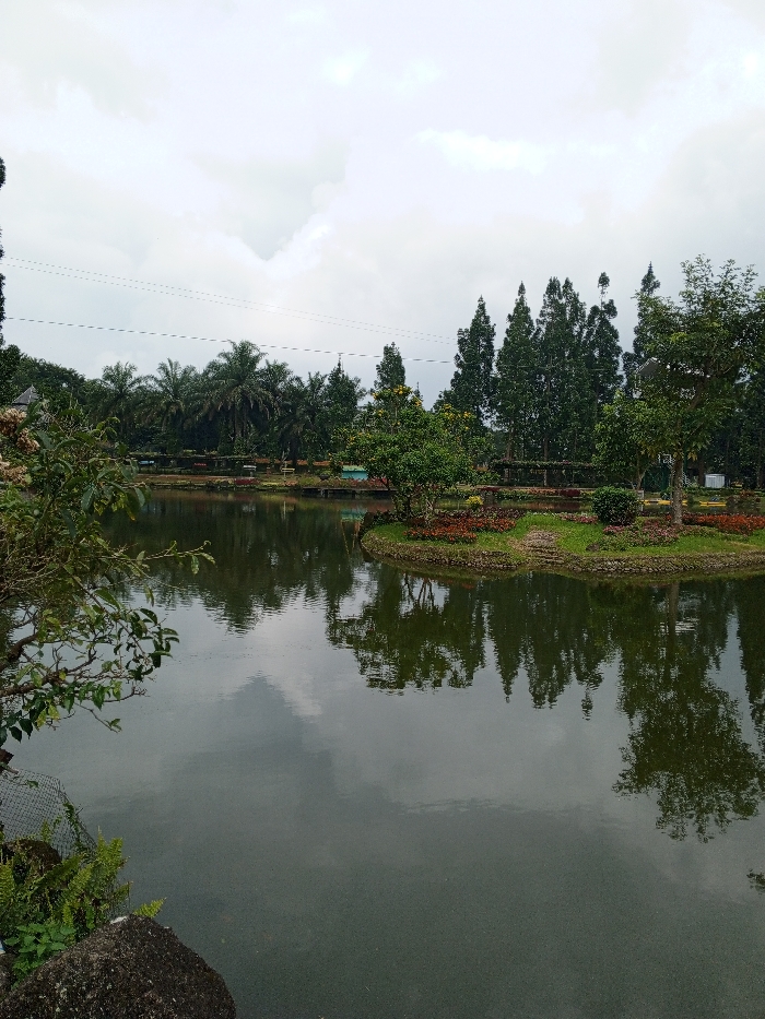 A serene lake reflects the cloudy sky above. The calm water mirrors a lush landscape with palm trees and tall evergreens. A small island in the lake is adorned with flowers and vibrant greenery. A stone and metal fence sit in the foreground. Powerlines intersect the sky.