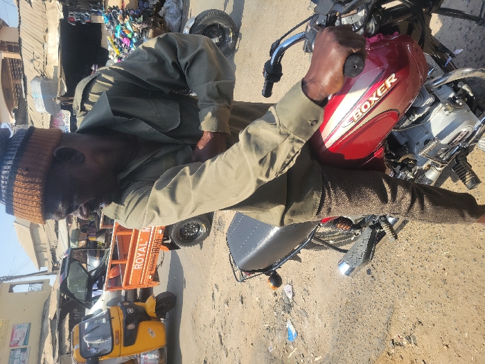This image depicts an outdoor street scene in Suleja, Nigeria, under bright daylight. An adult male, dark-skinned, is positioned on a red and white "Boxer" brand motorcycle, facing partially away from the camera towards his left. He wears a brown and black knit beanie, a long-sleeved olive green shirt, and dark brown textured trousers. His right hand is on the motorcycle's handlebar, and his left arm is bent with the hand near his right elbow. The motorcycle has a black seat and chrome exhaust. The ground beneath is an unpaved, light brown dirt surface with scattered debris. In the background, a yellow three-wheeled auto-rickshaw is visible to the left, followed by a silver car with an open trunk, and an orange utility trailer bearing "ROYAL M" text. Further right, a partial view of another motorcycle and a large stack of colorful footwear indicate a market stall. Several simple buildings with corrugated metal roofs form the backdrop, characteristic of a commercial street or market area.