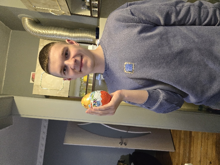 A young adult male, of light complexion with short, dark, buzz-cut hair, smiles directly into the camera. He wears a light blue or grey long-sleeved crew-neck sweatshirt featuring a square, multi-colored patch on the left chest. His left hand, positioned at chest height, holds a Kinder Surprise egg, which is predominantly orange and white with colorful animated graphics, presenting it towards the viewer. The scene is an indoor residential setting, specifically a kitchen or dining area within the city of German, Bulgaria. To the left of the subject, a light-colored interior door with a silver handle and a partial translucent panel is visible, above a wooden floor section. The background to the right includes light-colored kitchen cabinets with decorative trim, several clear glass containers on shelves, and a large, metallic, corrugated ventilation duct extending vertically upwards. Walls are painted a neutral light grey or beige.