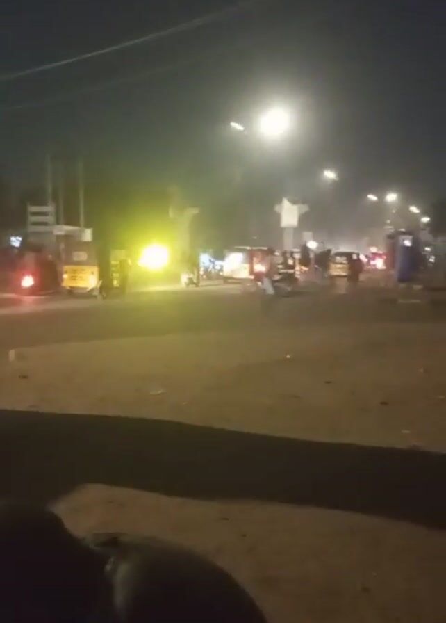street scene at night, with a visible intersection. Several vehicles, including auto rickshaws and motorcycles, are moving or stationary. There are a few people visible on foot, some standing near the vehicles. Streetlights illuminate the area, but the overall lighting is dim. The road surface appears uneven and dusty. The footage is captured from a slightly elevated position, and there's a partially visible dark object, possibly a part of the camera holder, at the bottom left of the frame. A "TECNO SPARK" watermark is present in the lower-left corner of the video.