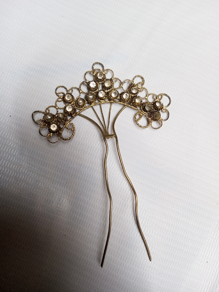 - "A close-up photograph, taken in Qarabucaq qəsəbə, Azerbaijan, displays an antique gold-colored metal hair ornament, likely a hairpin or hair comb" by FM-pCjCH3, licensed under CC BY 4.0