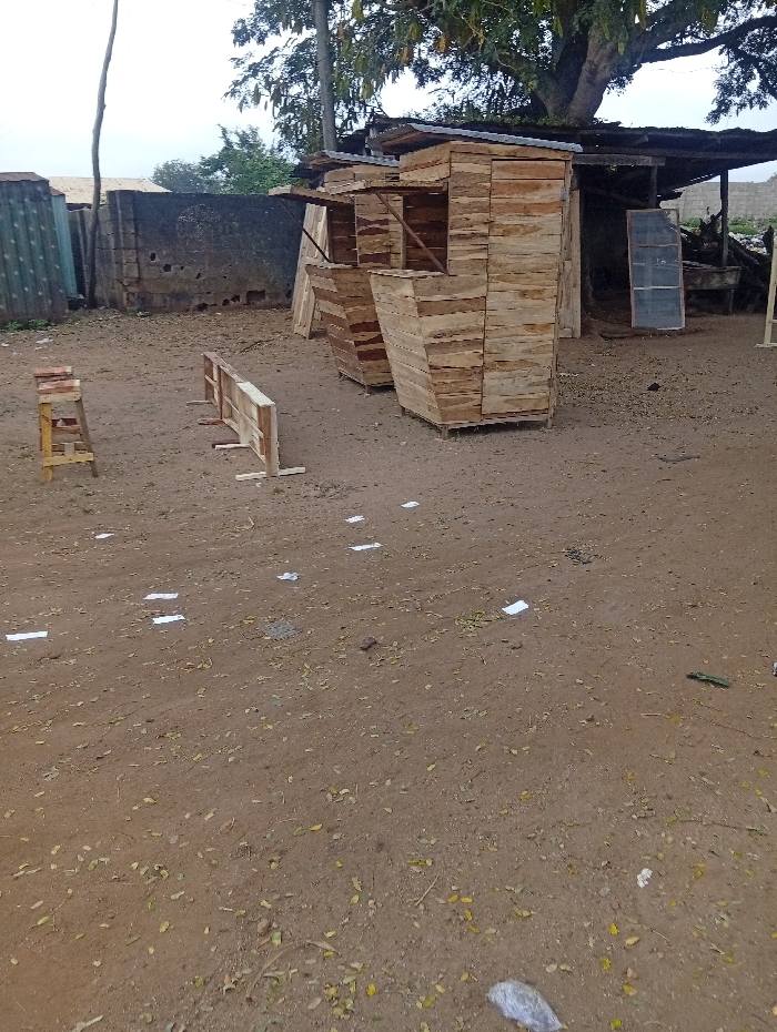 This image depicts an outdoor, unpaved area in Okene, Nigeria. The ground consists of reddish-brown earth, sparsely covered with dry leaves and numerous small pieces of white paper debris, along with a larger piece of clear plastic in the lower right foreground. In the midground, three newly constructed or partially constructed wooden market stalls/kiosks are centrally located. These structures are made of light-colored wooden planks, each featuring a solid base and an open upper section designed for service, topped with a dark, sloped roof. They are arranged in a staggered line, with the two rightmost kiosks being more clearly defined and similar in form. To the left of these stalls, a small, unpainted wooden stool or step-ladder stands upright, and further right, a long, low wooden frame rests on two smaller wooden supports. The background is dominated by a large, mature tree with green foliage on the right side. Beneath this tree, a rudimentary shelter with a dark, possibly corrugated metal roof and visible wooden supports is present. To the left of the tree, a weathered concrete block wall with visible stains and marks extends horizontally, adjacent to a section of corrugated metal fencing on the far left. The sky is overcast, providing diffuse lighting. No individuals are visible in the scene.