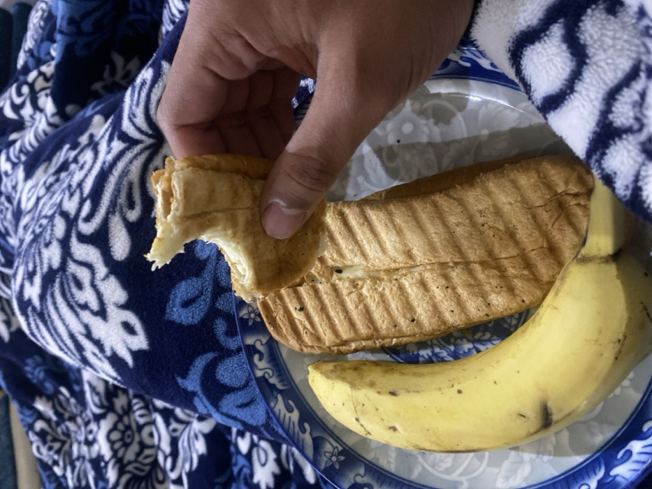 A hand holds a partially eaten panini, revealing melted cheese inside. The panini rests on a plate alongside a ripe banana, all partially obscured by a blue and white patterned blanket. The plate's design features a blue and white floral pattern along its rim. The overall scene suggests a cozy, casual setting.