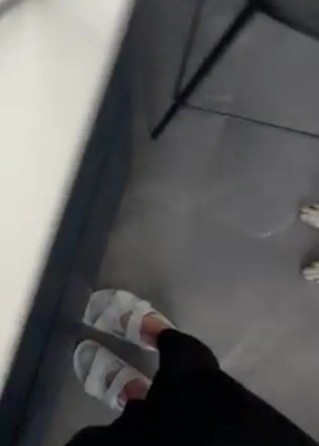 A person is preparing a meal on a heart-shaped plate, spreading something on a slice of bread and topping it with red caviar. The person is wearing black leggings and white sandals with socks, standing on a gray tile floor. A tan dog with pointy ears and a black nose looks up at the person.