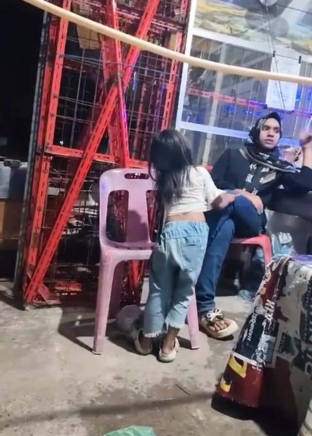Here is a detailed description of the video: The video shows a young child standing in front of a pink plastic chair. She is wearing a white shirt and light blue jeans. The child turns around and faces the camera briefly. Behind the child, a woman wearing a hijab is sitting in a chair, looking at her phone. A metal shelving unit is to the left of the child. A green plastic bag sits on the concrete ground. The scene appears to be outdoors at night, with dim lighting. A fan is visible on a wall in the background.