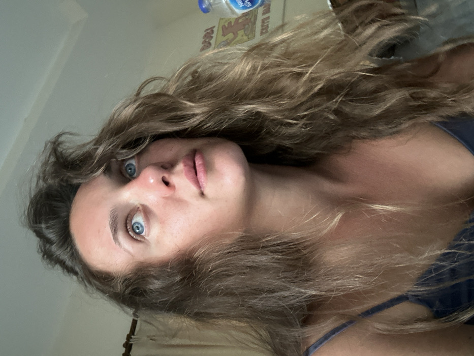 A female individual is depicted in a chest-up, close-range view within an indoor setting in Si Sunthon, Thailand. She has long, light brown, wavy hair, blue eyes, and tan skin, and is wearing a dark blue spaghetti-strap top. Her head is angled slightly upwards and to her right, and her gaze is directed upwards and to her left. In the background, to the right, a plastic water bottle with a blue cap and a partially visible "Nestlé Pure Life" label is present. Behind her, a light-colored wall features a poster displaying a cartoon character and text, including "BOBA." To the far left, a wooden curtain rod or beam is partially visible.