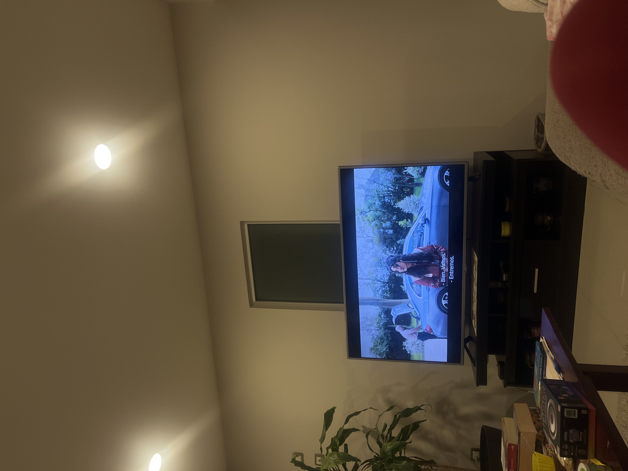 The scene depicts an interior residential space, likely a living room, located in Barrio de Nuevo León, Mexico. The foreground is dominated by a television screen centered on a dark brown media console. The television displays a still frame from a program featuring two individuals outdoors next to a light blue or silver sedan with its trunk open. A shirtless male in dark pants is bent over the open trunk on the left, while a female with dark hair, wearing a reddish-brown jacket and a patterned beanie, stands on the right looking towards the camera. Spanish subtitles, "Bien. Vamos." and "- Entremos.", are visible at the bottom of the screen. To the left of the television, a large potted plant with dark green leaves is partially visible, casting a shadow on the light beige wall. Above the television, a dark, rectangular, recessed opening or window with a light frame is centered on the wall. The room's ceiling, also light beige, features two circular recessed lights emitting a warm white glow. In the lower-left corner, a dark wooden coffee table holds a stack of books, a yellow bowl, and a black box labeled "SISTER" with "15 items" visible. The lower-right foreground shows a blurred portion of a red-clad leg, suggesting the viewer is seated on a light-colored, textured sofa, part of which is visible along with a light-colored woven basket or bin next to it. The overall lighting suggests an indoor evening or nighttime setting.