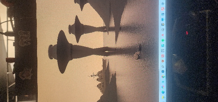 This image is a photograph of a computer monitor displaying a digitally rendered or conceptual artwork. The scene depicted on the monitor features a calm body of water under a light, monochromatic sky, suggesting either dawn, dusk, or an ethereal atmosphere. Three prominent, grey, futuristic structures stand in the water. The two largest, positioned in the midground, are mushroom-shaped or disc-topped, supported by tall, slender, inverted conical bases. The structure on the left is larger and more clearly defined than the one on its right. A third, darker, indistinct structure or landmass is partially visible further to the right. Reflections of these structures are visible in the water. In the mid-distance to the left, two large grey naval warships, likely destroyers or frigates, are visible on the water, with dark, irregular landforms or hills behind them. In the immediate foreground, a small, light-colored, indistinct object floats on the water's surface, slightly to the left of the central axis. The location depicted in the conceptual artwork on the monitor is not a real-world site within Abuja, Nigeria. Abuja is an inland city, and the scene's presence of large naval warships in a bay-like or open water setting, along with the futuristic architectural elements, is inconsistent with its known geography and urban landscape. Above the monitor screen, a dark, textured surface, likely a desk or shelf, holds several indistinct objects, including what appear to be two bottles or containers (one brown, one dark) and two faint, abstract, light-colored patterns. Below the displayed artwork, the bottom edge of the monitor shows a segment of a computer taskbar with numerous application icons. Below the taskbar, a black, textured surface, possibly a desk or keyboard, is visible, with a small red indicator light on the right side.