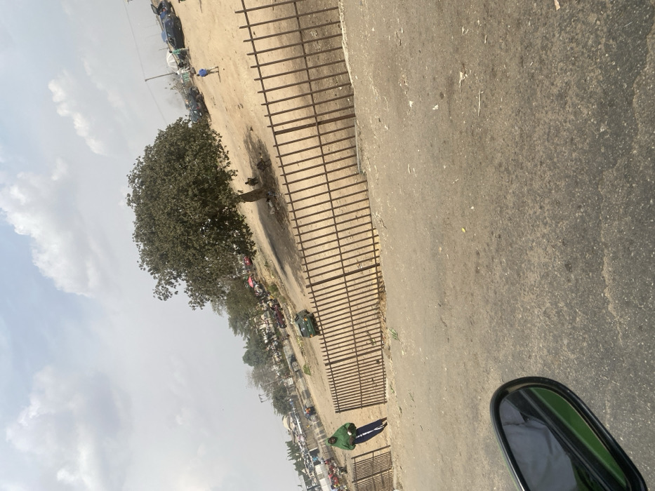 The image displays an outdoor scene in Madalla, Nigeria, captured from a vehicle on a paved road. In the immediate foreground, the lower left quadrant of a green vehicle's side mirror is visible, reflecting a green surface. The paved road surface appears gray, worn, and covered with light dust. A rusted metal fence, constructed from vertical bars, horizontally spans the midground, delineating the paved road from an expansive, unpaved dirt area beyond it. To the left of the fence, on the paved section, an individual wearing a green hooded garment and dark trousers stands, facing towards the right, holding a white object. Beyond the fence, a large, deciduous tree with dense green foliage stands centrally in the dusty, light-brown dirt expanse. Two dark figures are seated on the ground beneath this tree. A light green sedan is parked within the dirt area, positioned to the left of the large tree. Further into the background, numerous vehicles are parked across the open dirt area; some display open trunks. Several individuals are present among these vehicles, including one person in a blue shirt located to the right of the central tree. Buildings with light-colored roofs are partially visible in the far background on the left. The sky above is partly cloudy, featuring white cumulus clouds against a pale blue background.
