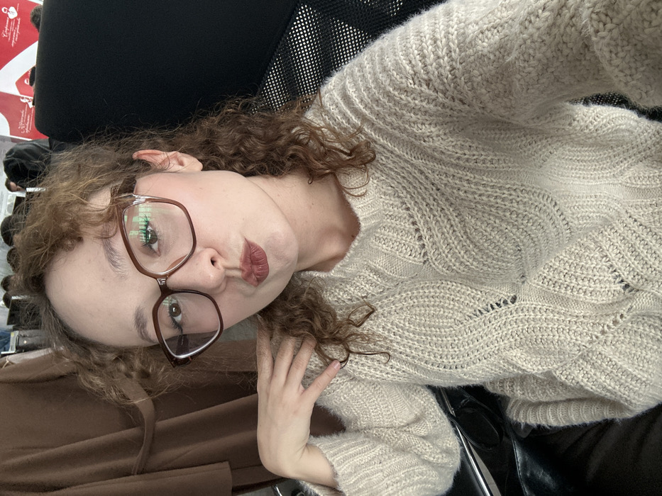 The image captures a young adult female in a close-up selfie within an indoor, professional environment