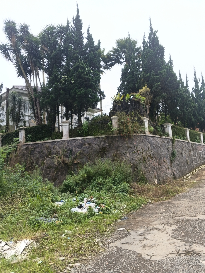The image depicts an outdoor scene in Candelaria, Philippines, under an overcast sky. In the foreground, a dark, uneven paved surface, possibly asphalt or gravel, slopes upward from left to right, exhibiting damp patches. To the immediate left of this path, a dense mass of green and dry vegetation covers the ground, partially concealing an accumulation of refuse, including plastic bottles, bags, and other assorted debris. A prominent feature in the midground is a tall retaining wall constructed from irregular, dark gray stone blocks, extending horizontally across the frame. This wall supports an elevated property. Atop the wall, a black metal fence with decorative scrollwork is interspersed with white, square-based pillars. Behind this fence, a meticulously trimmed green hedgerow is visible. Towards the right side of the elevated area, a dark, rock-like sculptural or water feature, overgrown with various plants including ferns, is situated. In the background, behind the retaining wall and fence, a large, multi-story light-colored residence with a dark roof is partially visible on the left. The property is heavily landscaped with numerous tall, dense green trees, including several conifer-like species and tall, multi-trunked palm-like trees, which largely obscure the residence. No individuals are present in the scene.