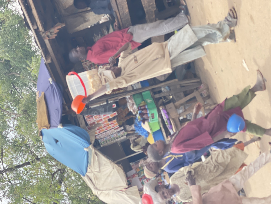 The image depicts an active outdoor market street scene in Zaria, Nigeria, under a bright sky with green tree foliage visible above