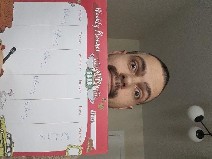 An adult male is depicted indoors, with his face partially obscured by a weekly planner
