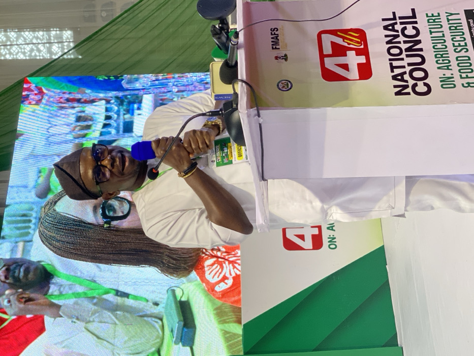 An African man, wearing a white traditional garment, a brown cap, and black-framed glasses, is positioned centrally, speaking into a blue-topped microphone held in his right hand. He wears a gold-colored wrist watch, multiple bracelets on his left wrist, and a green-and-white "OFFICIAL" lanyard. He stands behind a white rectangular podium. The podium's front banner displays a prominent red "47" logo, the text "NATIONAL COUNCIL ON: AGRICULTURE & FOOD SECURITY," and smaller insignias for "FMAFS" and a Nigerian emblem. Multiple black and green microphones, along with documents, are arranged on the podium surface. The background features a large projection screen showing partial images of other individuals, including a man in a white garment on the upper left and a woman with braided hair, glasses, and an orange patterned top on the mid-left. Green fabric panels are visible on the right side of the indoor setting, which is located in Unguwar Sarki, Nigeria. The floor is a light color.