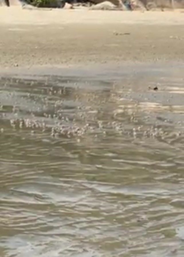The scene shows a sandy beach with shallow water lapping at the edge. There is a large group of small creatures, possibly crabs or other invertebrates, congregating on the wet sand where the water meets the shore. Behind the beach, there are large rocks and some greenery. The water is murky, and the day appears sunny.