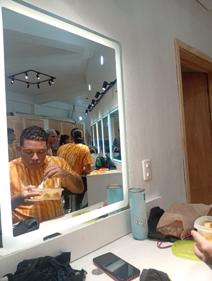 A light-up mirror reflects a man in an orange tie-dye shirt eating from a plastic container. Others are reflected in the mirror. In front of the mirror, a surface holds a phone, blue tumbler, and a partially visible food container. An open doorway is partially visible to the right of the mirror. A light switch is on the wall.